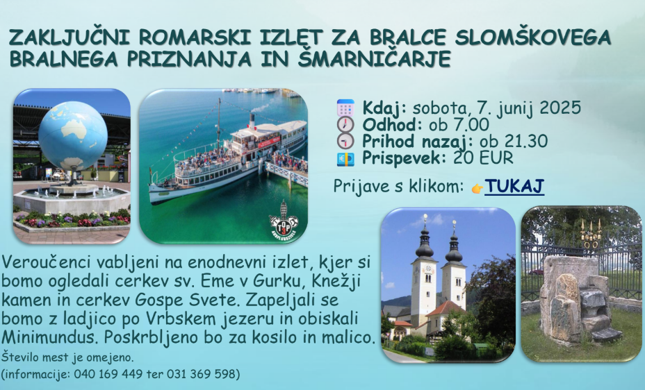 za veroučence, ki so že ali še bodo opravili Slomškovo bralno priznanje ter tiste, ki bodo vestno obiskovali šmarnice, se organizira enodnevno romanje kot nagrada in vzpodbuda za naprej, da bodo z duhovnim branjem in šmarnicami zoreli v veri. Več v priponki.